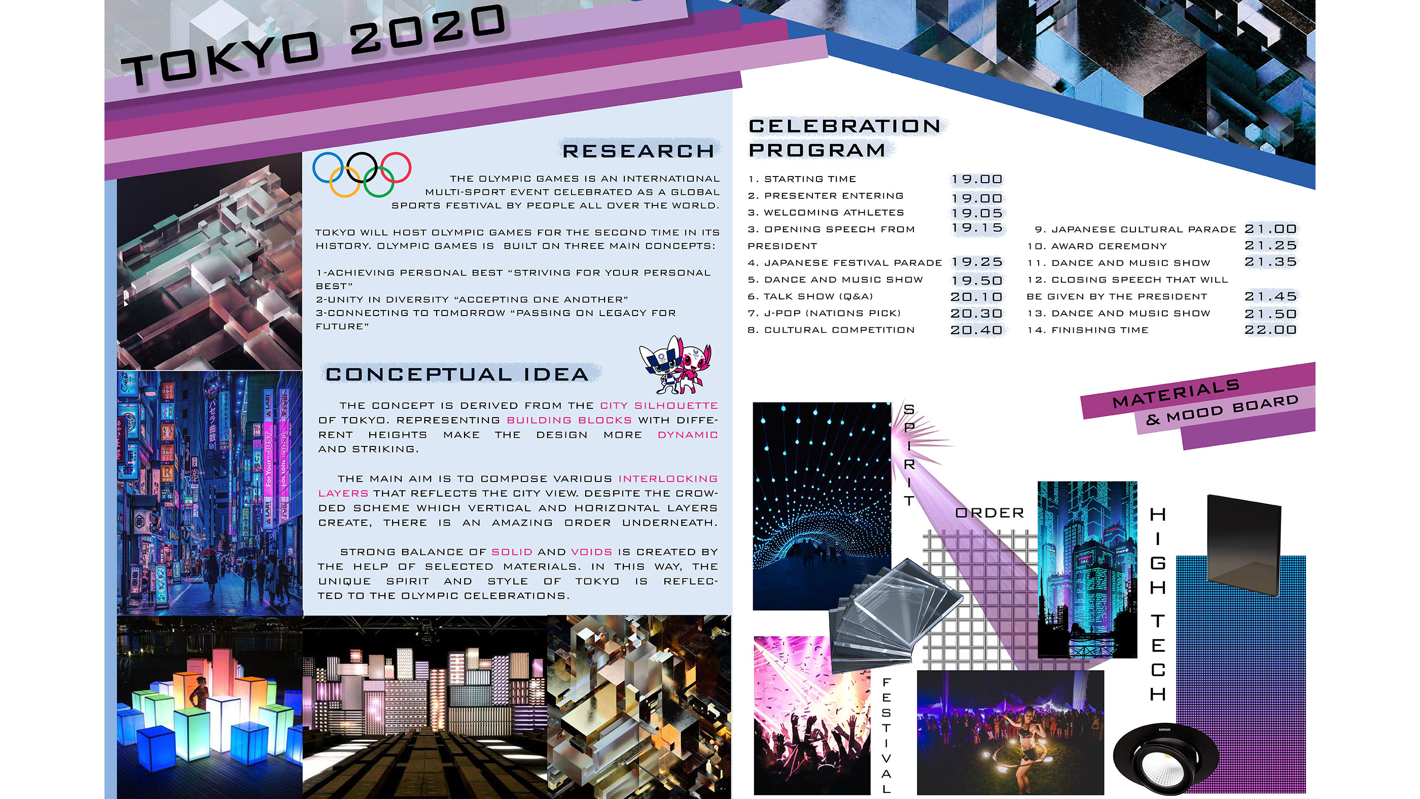 The aim of the project is to design a TV set studio to celebrate 2020 Tokyo Olympics. As a group, we selected our own concept and scenario inspired by the city silhouette of Tokyo. In this project, background view, camera angles and camera shots were the most significant considerations.